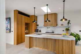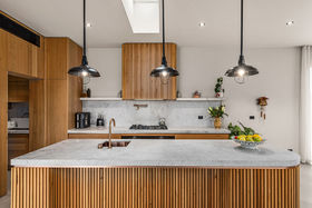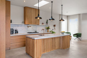At the heart of the home, the gourmet kitchen showcases craftsmanship and innovation: a fluted hardwood island bench, 60mm stone surfaces, Bosch appliances, dual ovens, five-burner cooktop, and an integrated dishwasher all concealed within hand-finished rounded cabinetry. A true butler's pantry includes a secondary sink and space for a family-sized refrigerator.