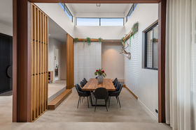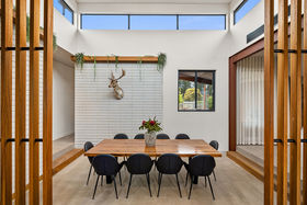 Upon entry, solid double doors open to reveal a sunken dining area framed by clerestory windows and a soaring 5.3-metre northern wall"an introduction that immediately conveys scale, volume, and sophistication.