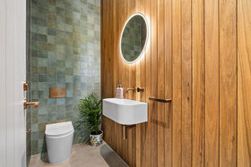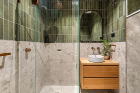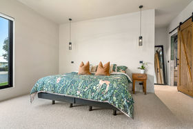 The master suite is a sanctuary of calm, complete with a timber-accented ensuite finished in soft eucalypt tones and brushed copper ABI fittings, mirrored throughout the home's refined interior palette. A custom walk-in robe complements the suite's sense of indulgence. A separate retreat or study connects two secondary bedrooms, both sharing a luxurious bathroom with a sculptural step-down Roman bath"one of many bespoke features. The fourth bedroom, with its own ensuite, provides the ideal guest or grandparent accommodation.