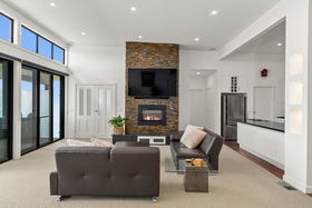 The lounge is centred around a dramatic stacked stone fireplace with built in bench seating, creating a striking focal point and a warm gathering space for winter evenings.