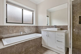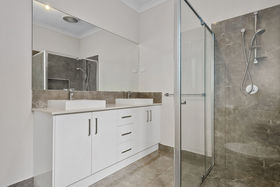 The master suite is complete with a spacious walk-in robe and a luxurious ensuite featuring double sinks and an oversized shower. The three additional bedrooms are situated in a separate kids' wing, all with built-in robes and access to a central bathroom with bath and separate toilet, ensuring privacy and convenience.
